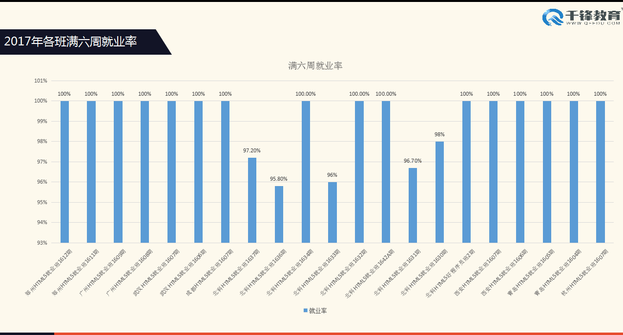 毫不夸张的说,在2015、2016两年HTML5用人荒之际,是千锋HTML5撑起了前端行业的半壁江山,HTML5行业并不可能萎缩,而是平稳持续上涨。从2016年统计的数据来看,企业对与HTML5这相关职位还都郑处在摸索试探阶段,整个行业的招聘要求也正在逐渐的规范化,准确化。这也充分证明,这个行业还处在发展初期,真正的热潮还没有到来,我们只是经历了巨浪来袭之前的初潮。2017年HTML5依然强势,千锋HTML5责任重大,我们要打造国内前端行业的万里锦绣河山!